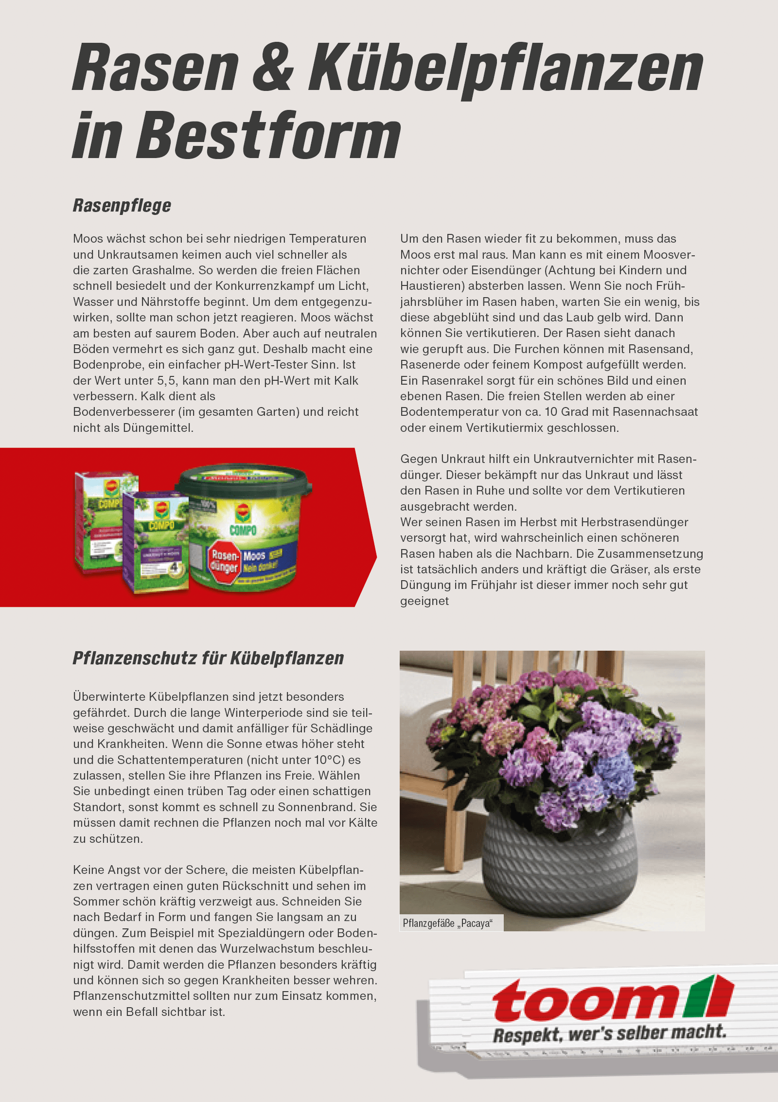 Unser Mietpartner der toom Baumarkt gibt wertvolle Tipps für die Pflege von Rasen und Pflanzen im Frühling. Ob Gewächshaus, Kübelpflanzen oder Gartenbeet – mit den richtigen Maßnahmen starten Pflanzen gesund und kräftig in die neue Gartensaison.